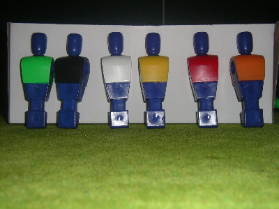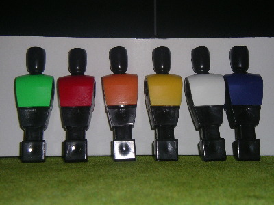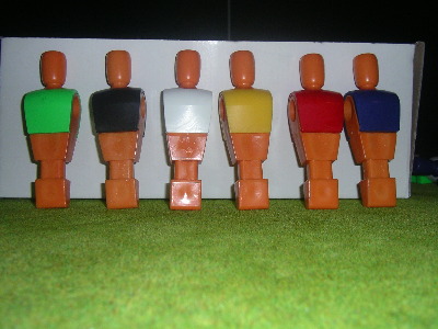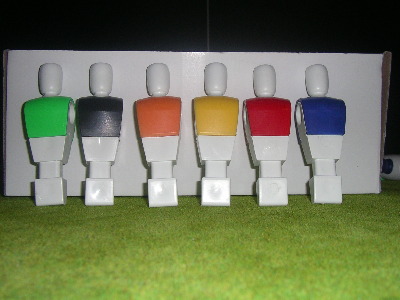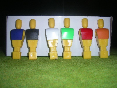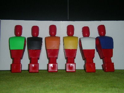 Der Preis pro Figur beträgt 5 ,-. Erstehen Sie eine gesamte Mannschaft, also 11 Figuren, erhalten Sie unseren Sonderrabatt. Bestellen Sie 11, bezahlen Sie aber nur 10. Unsere Kickerfiguren sind für 16 mm Stangen gefertigt.