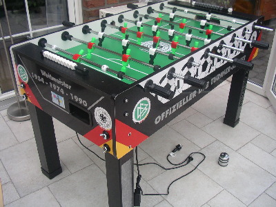 Natürlich können Sie bei uns nicht nur Figuren kaufen, sondern auch ganze Kicker! Wir bieten nur ein Kickermodell an, da dieser in allen Aspekten seine Konkurrenz überragt. Die Lackierung des Kickers können Sie individuell ihren Bedürfnissen anpassen. Dies gilt ebenso für die Mannschaften. Im unteren Bild haben wir das Spiel Deutschland-Portugal nachgestellt. Die Mannschaften sind im Preis inklusive, für die Lackierung erheben wir eine Gebühr von 10,-. Der Kicker kostet 450,-. Natürlich erhalten sie auch beim Kauf eines Tisches die eimalige Möglichkeit ihre Figuren bedrucken zu lassen. Schicken sie uns einfach ein Bild der gewünschten Personen und den Rest übernehmen wir. Bei Fragen und Bestellung schicken Sie uns eine e-mail oder kontaktieren Sie uns telefonisch.